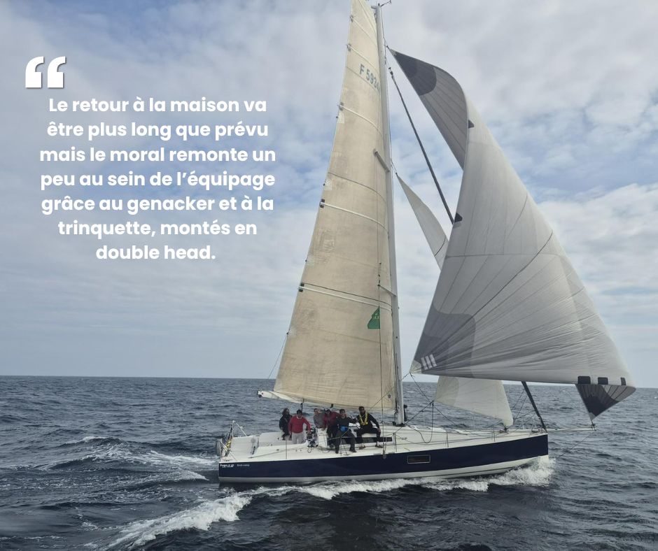 Le retour à la maison va être plus long que prévu mais le moral remonte un peu au sein de l’équipage grâce au genacker et à la trinquette, montés en double head.